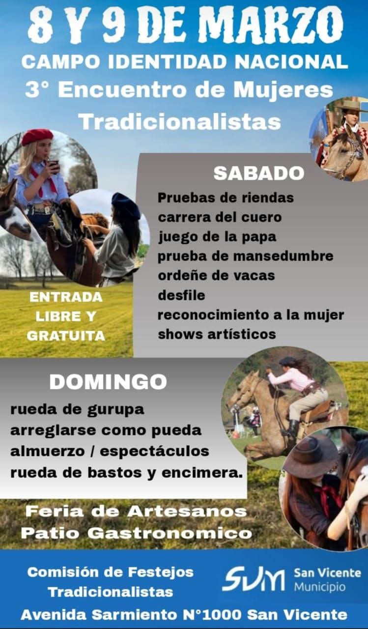 Será en San Vicente, el sábado 8 de marzo, día de la mujer, a las 14 hs. en el predio Identidad Nacional.